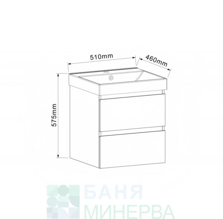 Шкаф с 2 чекмеджета с релси DTC със soft-close и пластмасов U-канал. PVC конструкция – 15 мм панели и 5 мм гръб. Боядисан отвън, доставя се сглобен с керамична мивка 5953W-51CM