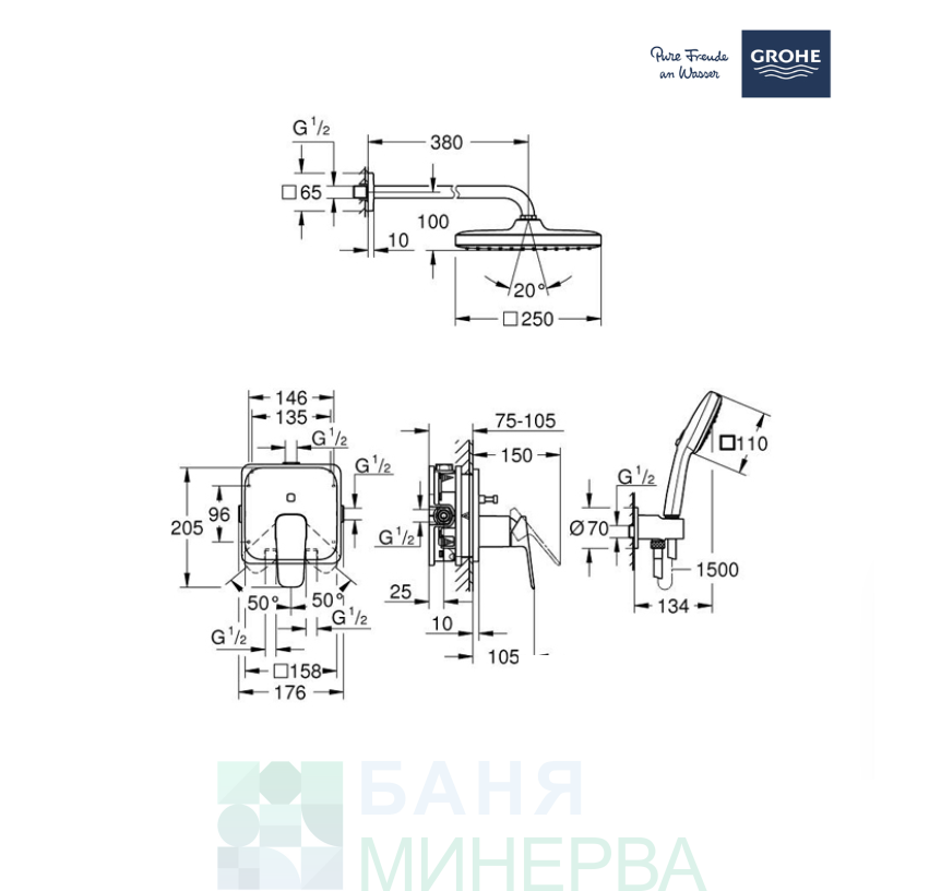 душ пита Tempesta 250 Cube 9.5 l/min (26 687) с хоризонтално рамо 380 mm