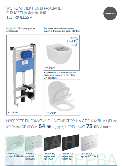 Код: IDEALSTANDARD R059701 WC КОМПЛЕКТ ЗА ВГРАЖДАНЕ С БИДЕТНА ФУНКЦИЯ Tesi Rimless Категория: