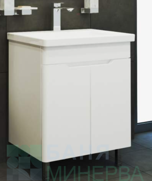 Долният шкаф е на крака, с размери ш.60 д.44,5 в.87см, има две врати с плавно затваряне. Порцеланова мивка. В цената не е включен смесител